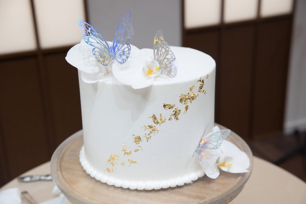 ケーキには胡蝶蘭のお花と蝶々の